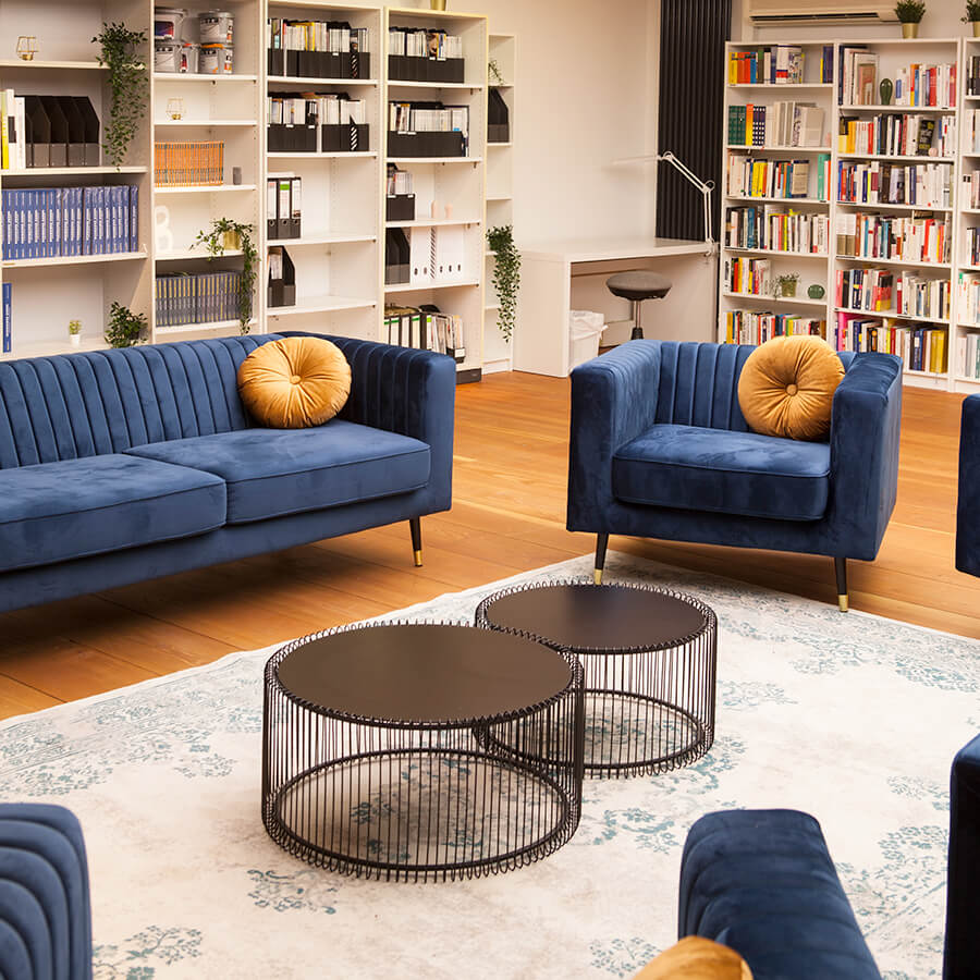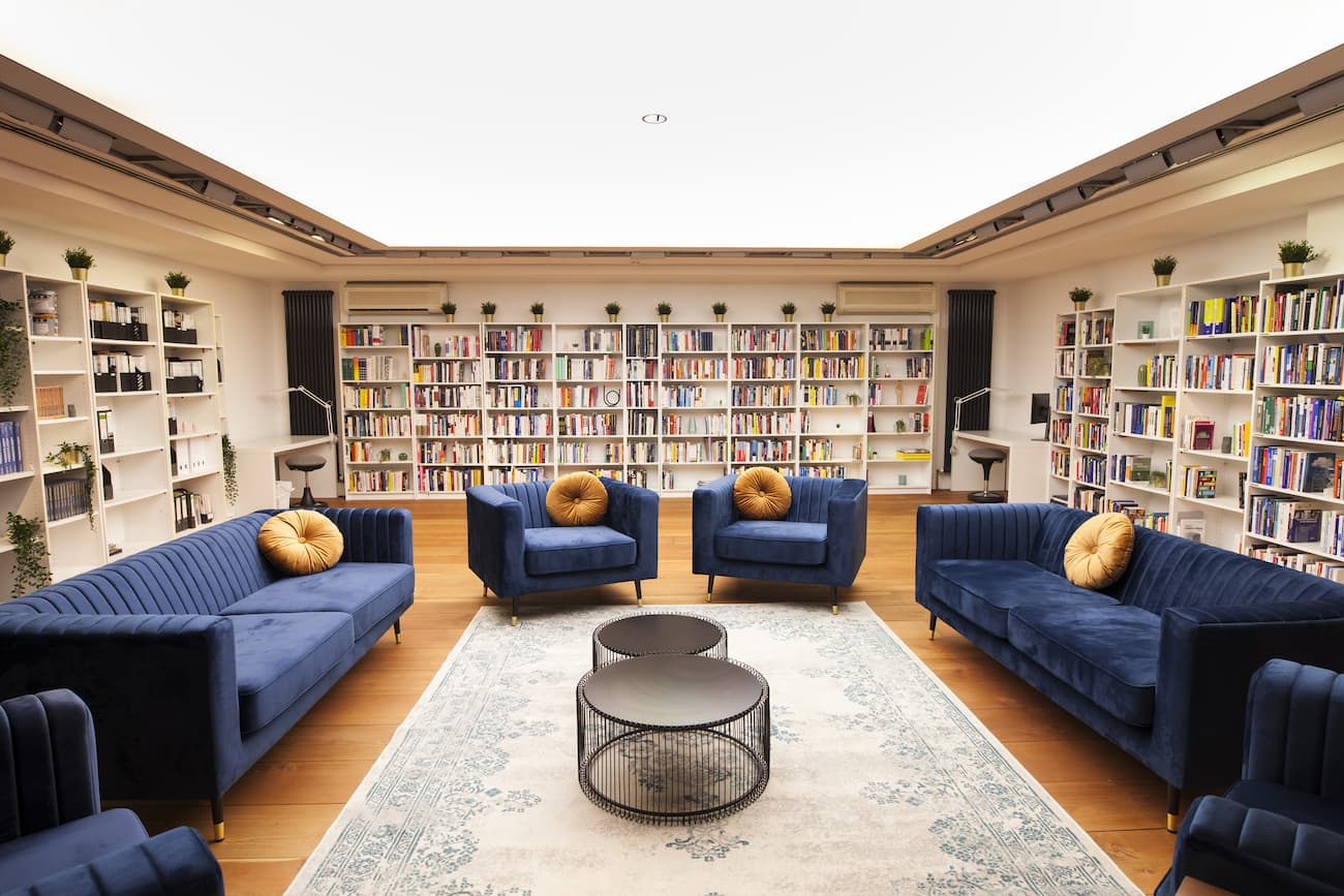 Gerade Gebäude, die auf Kommunikation und Kreativität ausgelegt sind, brauchen auch Rückzugsräume, also Umgebungen, in denen man zur Ruhe kommen, konzentriert arbeiten oder lesen kann. Dazu dient auch die Bibliothek im Erdgeschoss. Mit Tausenden Büchern ist es eine literarische Schatzkammer, ein Ort der Geschichten. Im Raum-Steckbrief formulierten wir, es sei das „Herzstück des Gebäudes. Hier ist der Ursprung,