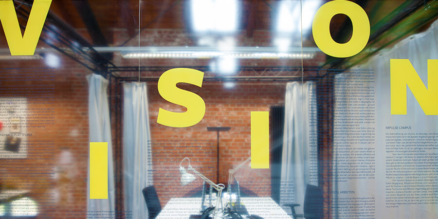 In der Komfortzone haben wir den Text, der den 12. Dezember 2025 beschreibt, für jeden nachlesbar, mit Folie auf Plexiglas aufgebracht. Die Vision beschreibt nicht nur unsere Werte, unsere Firmenkultur und unser Geschäftsmodell. In den letzten Absätzen werden auch unsere „neuen Räume“ beschrieben – als „lebendiger Ort der persönlichen Begegnung, Wissensvermittlung und Inspiration“. Es gebe „viele Pflanzen“, lichtdurchflutete, helle Räume, Sofas und kleine Tische – mit vielen Vorträgen, Austauschrunden und Bar-Camps. „Es ist ein Ort, an dem man gern ist und der einen inspiriert. Wir bringen Menschen zusammen, feiern Ideen, kreatives Denken und neue Impulse.“