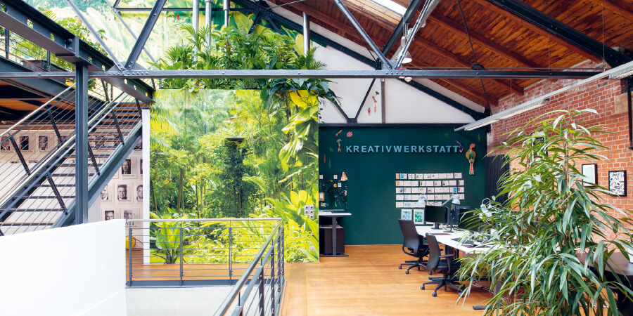 In der zweiten Etage, auf der Höhe der Komfortzone, befindet sich auch die Kreativwerkstatt, direkt neben dem impulse-Dschungel. Im Steckbrief stand: „Raumcharakter: Die Natur kommt in das Büro. USP: Urwald im Büro“. Auch wenn die gesamte Magazinproduktion inzwischen digital läuft, ist hier Platz, um Magazinseiten zu entwerfen, auszudrucken und an der Wand aufzuhängen. Zudem gibt es einen Schneidetisch. Und mitten im Raum entstehen neue Pflanzen – ein Dutzend Gläser mit Setzlingen: ein „Pflanzenkindergarten“.