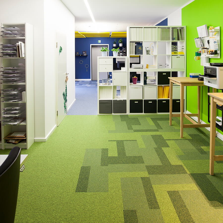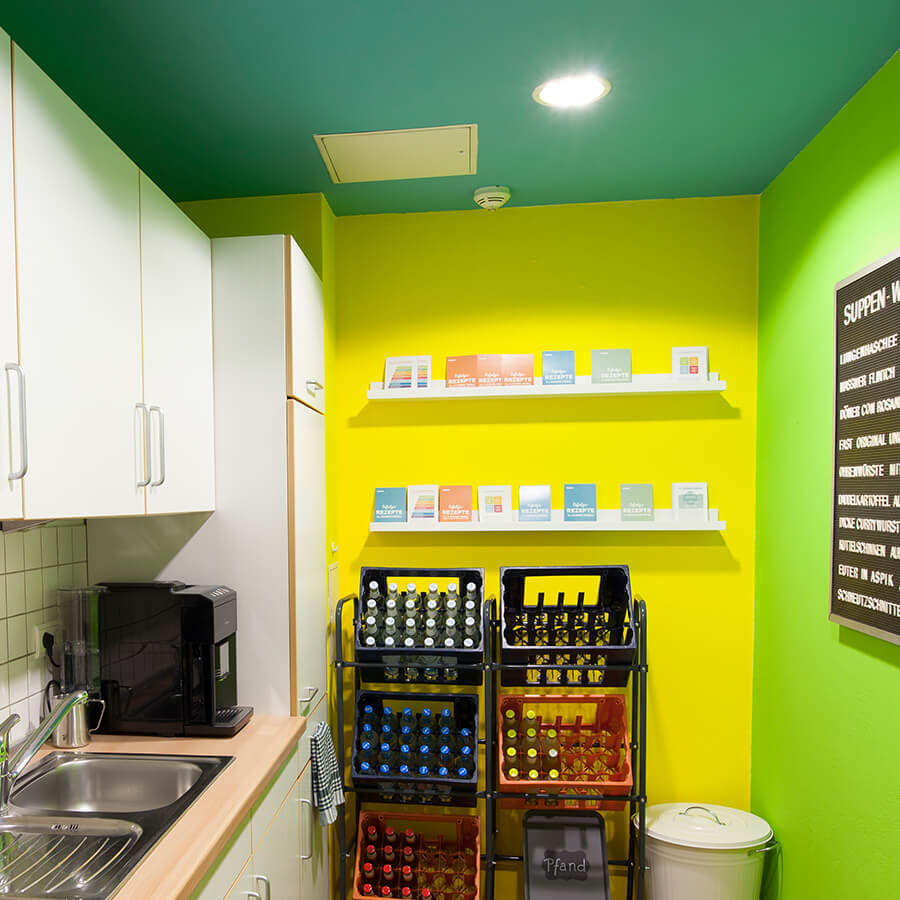 So sehr man auch mit unternehmerischen Herausforderungen zu kämpfen hat, es gibt zum Glück erprobte Methoden, die helfen können. In der Kaffeeküche stehen deshalb für Seminarteilnehmer – in Postkartengröße zusammengefasst – lauter Management-Rezepte, die nach und nach erweitert werden, beispielsweise Change-Management-Ansätze, das Eisberg-Modell oder, für ein besseres Zeitmanagement, eine Erläuterung der Eisenhower-Matrix. Als Aufgabe des Raum hatten wir in der Konzeptphase definiert, die Kaffeeküche müsse „Farbenergie“ ausstrahlen; außerdem müsse es eine klare Form- und Farbsprache geben. Deshalb wurde er in den (impulse-)Farben Gelb, Grün und Türkis gestrichen.