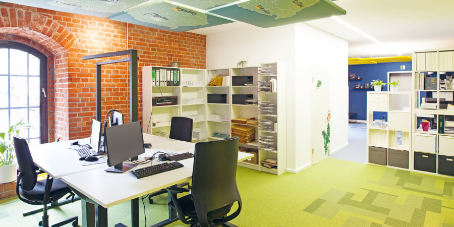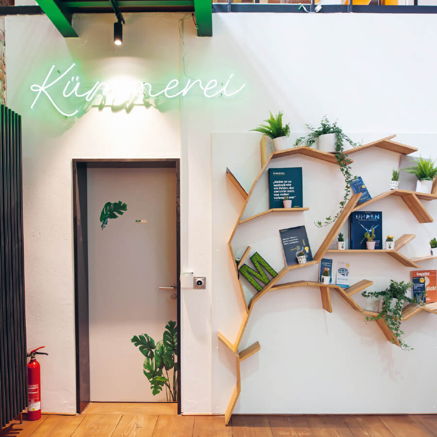 In der zweijährigen Corona-Phase, in der sich seit März 2020 ein Lockdown an den nächsten reihte, fand das Gros der Kundenkommunikation rein digital aus dem Homeoffice statt. Künftig wird es wieder mehr Leben in der Kümmerei geben. Bücher und nachbestellte Magazine werden von hier aus verschickt. Jeder Mitarbeiter und jede Mitarbeiterin hat zudem ein eigenes Postfach. Den Weg in die Kümmerei leuchtet vom Foyer aus eine grüne Neonschrift.