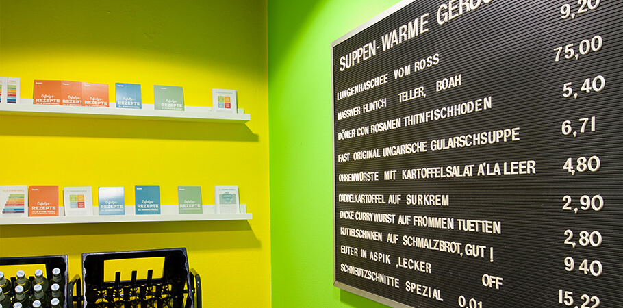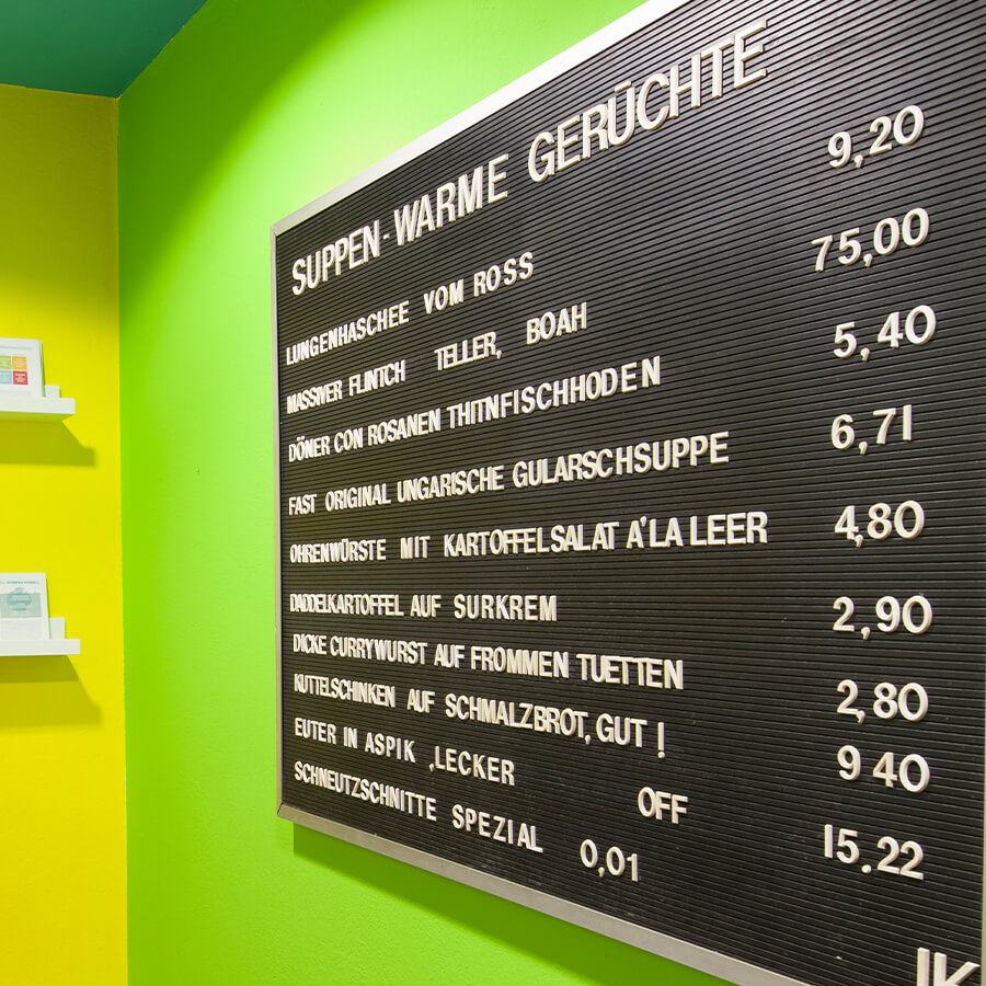 An der Wand hängt eine nicht ganz ernst gemeinte Kantinentafel – ein Fundstück aus Hammerbrook, wo der Verlag von 2013 bis 2021 residierte. In einer Straße unweit des Verlags hatte ein impulse-Mitarbeiter eines Tages die Tafel entdeckt, kurzerhand mit in den Verlag gebraucht, wo es dann jahrelang in der Grafik hing. Auf diesen schrägen, nicht ganz jugendfreien Humor konnten wir natürlich auch im MachWerk nicht verzichten.
