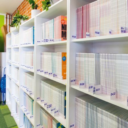 In der zweijährigen Corona-Phase, in der sich seit März 2020 ein Lockdown an den nächsten reihte, fand das Gros der Kundenkommunikation rein digital aus dem Homeoffice statt. Künftig wird es wieder mehr Leben in der Kümmerei geben. Bücher und nachbestellte Magazine werden von hier aus verschickt. Jeder Mitarbeiter und jede Mitarbeiterin hat zudem ein eigenes Postfach. Den Weg in die Kümmerei leuchtet vom Foyer aus eine grüne Neonschrift.