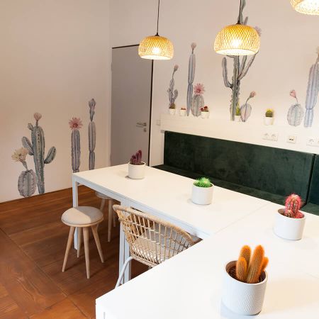 Neben dem Mach-es-Raum gibt es einen kleineren Raum voller Kakteen: Die Oase ist der Pausenraum für Seminarteilnehmer. In der äußersten Ecke des MachWerks gelegen strahlt er Ruhe aus. Es ist ein Raum der Entschleunigug und ein Ort, um Energie und Kraft zu tanken. In der Oase blühen die Kakteen immer wieder neu auf. Sie sind – wie auch Unternehmer – Überlebenskünstler. Gemeinsam mit Sukkulenten stehen Kakteen für Widerstandskraft. Im Raumsteckbrief – zur Konzeption – hieß es: „ Wir bei impulse und auch unsere Unternehmer sind auf Entdeckungsreise und gestalten immer wieder Neues. Wir sind dabei wie eine Karawane, die mutig neue Gebiete entdeckt und sich auf dieser Reise gemeinsam die Zeit nimmt, eine Pause einzulegen, um zu tanken und sich auszuruhen.“
